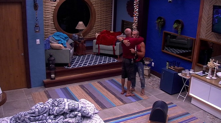 Após formação do nono Paredão, Ayrton abraça Kaysar no Bangalô do Líder e diz: "Estou triste porque a gente está junto. Mas tranquilo. Faz parte". A família Lima enfrenta Kaysar e Caruso na berlinda desta semana.