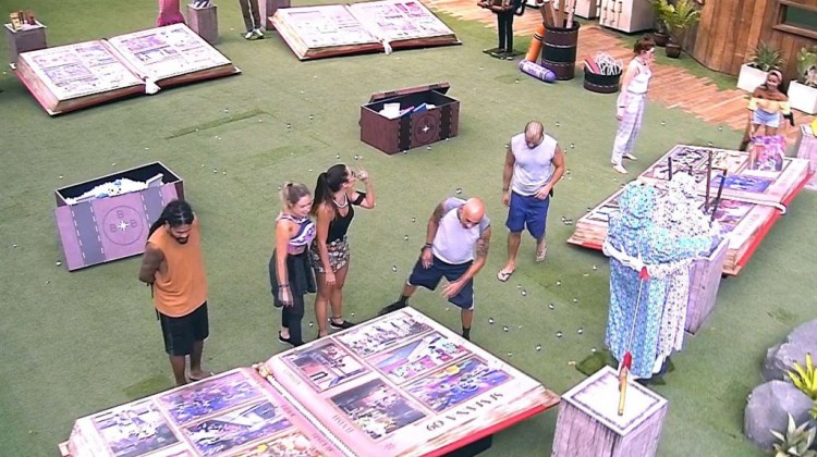 No gramado, Tiago Leifert confere com os brothers o gabarito da Prova da Comida Big Álbum. Eles tiveram 15 minutos e tentaram acertar a cronologia de acontecimentos do BBB18 como Provas do Anjo, Castigos do Monstro e festas.