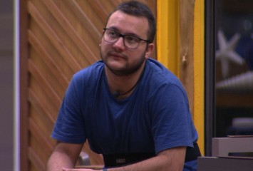 Caruso está conversando com os brothers na varanda e recebe o aviso para buscar a pizza na despensa...